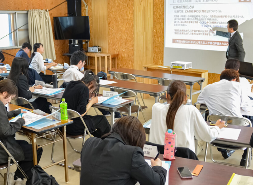 社内の新入社員に加え、取引先や協力会社にご入社された新入社員を対象とした社内外合同の新人研修を実施しています。新入社員を迎えたいものの、十分な研修体制を整えることが難しいお客様のニーズに応える取り組みです。社会人基礎はもちろんのこと、業界基礎知識や現場で必要な安全意識、住宅設備・建材ショールーム見学など、実務の基本を体系的に学べる内容とし、即戦力としての土台づくりを支援。企業の垣根を越えた人材育成を通じて、業界全体・地域の建築品質と安全性向上に貢献しています。